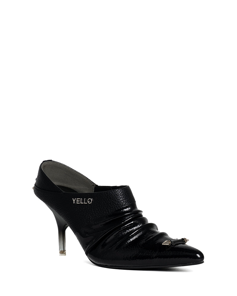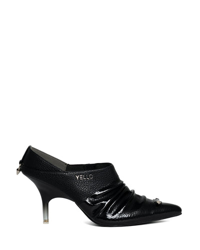 These standout mules combine edgy accents with elegant draping for a bold, fashion-forward statement. The pointed toe and approximately 8.6cm gradient heel flatters the legs with a sleek silhouette. The upper securely conforms to the instep and features a partial rubber-dip finish, creating a subtle yet striking contrast. Loops at the toe and heel are decorated with piercing-inspired metal hardware for an underground-inspired twist. Equally suitable for casual wear or special occasions, these mules transition seamlessly across seasons. Finished with a logo charm at the opening and available in black, white, and khaki—each pair offers a sophisticated, slightly fetish-inspired edge.