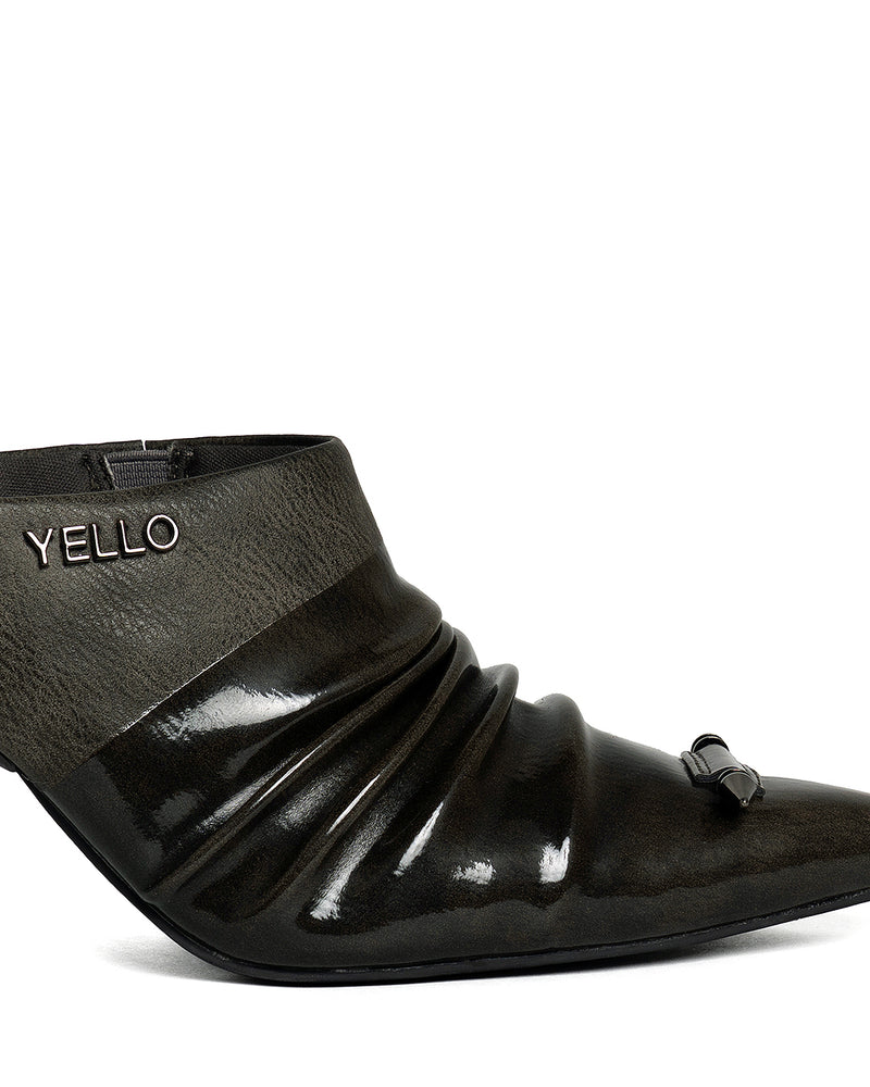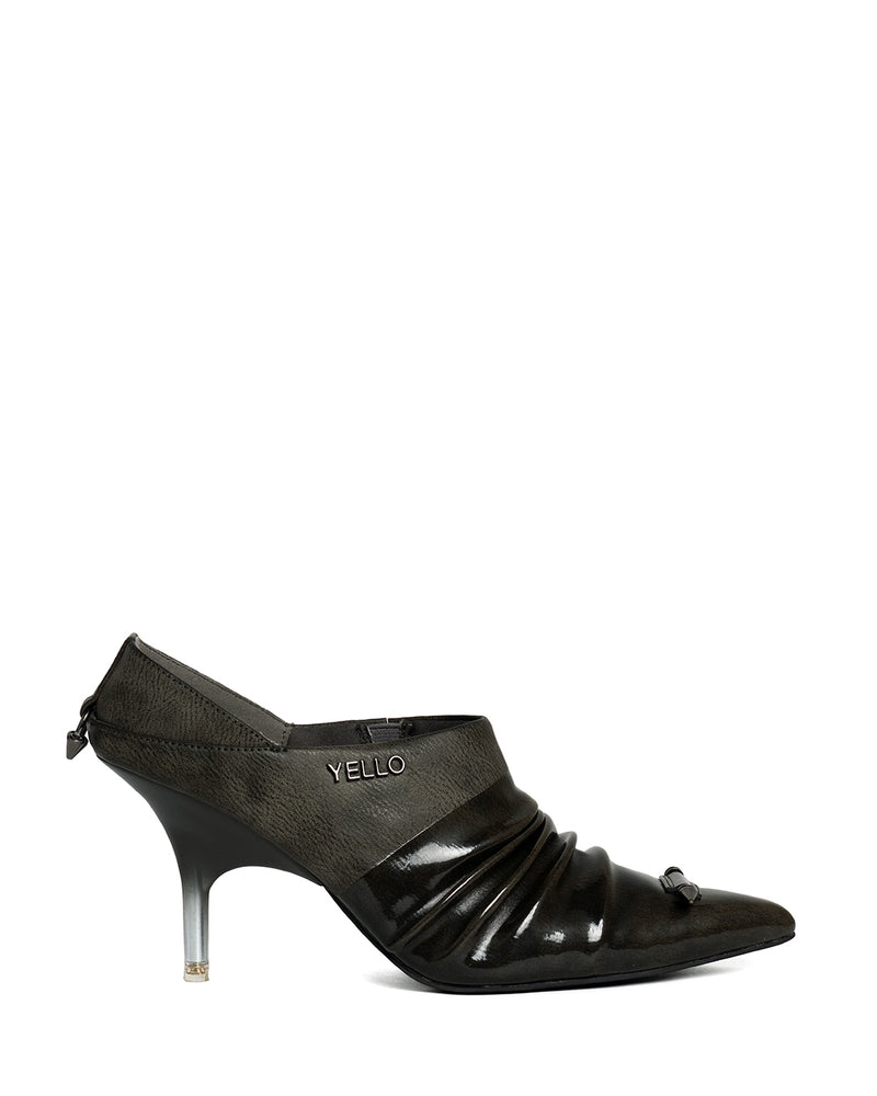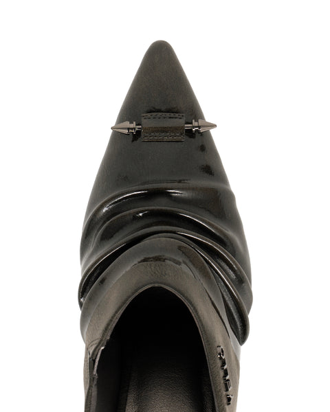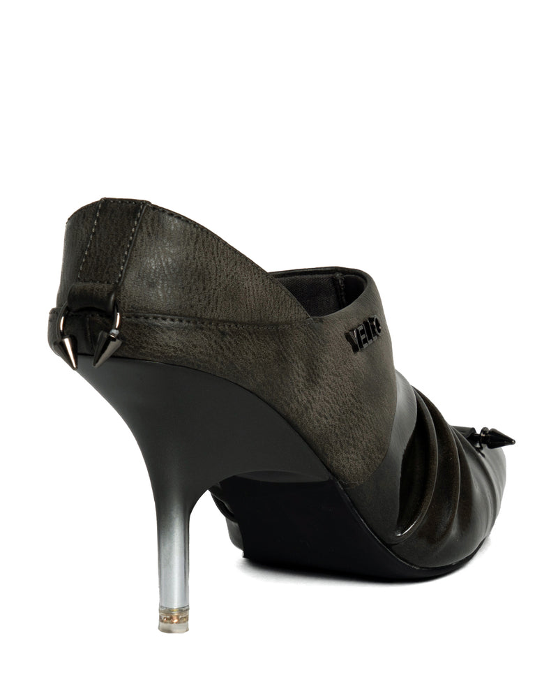 These standout mules combine edgy accents with elegant draping for a bold, fashion-forward statement. The pointed toe and approximately 8.6cm gradient heel flatters the legs with a sleek silhouette. The upper securely conforms to the instep and features a partial rubber-dip finish, creating a subtle yet striking contrast. Loops at the toe and heel are decorated with piercing-inspired metal hardware for an underground-inspired twist. Equally suitable for casual wear or special occasions, these mules transition seamlessly across seasons. Finished with a logo charm at the opening and available in black, white, and khaki—each pair offers a sophisticated, slightly fetish-inspired edge.