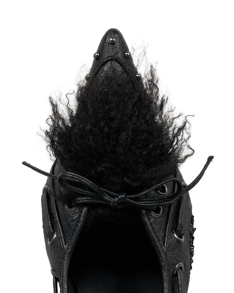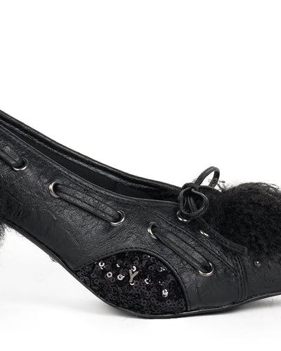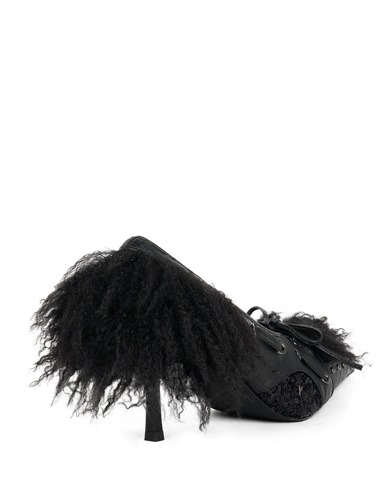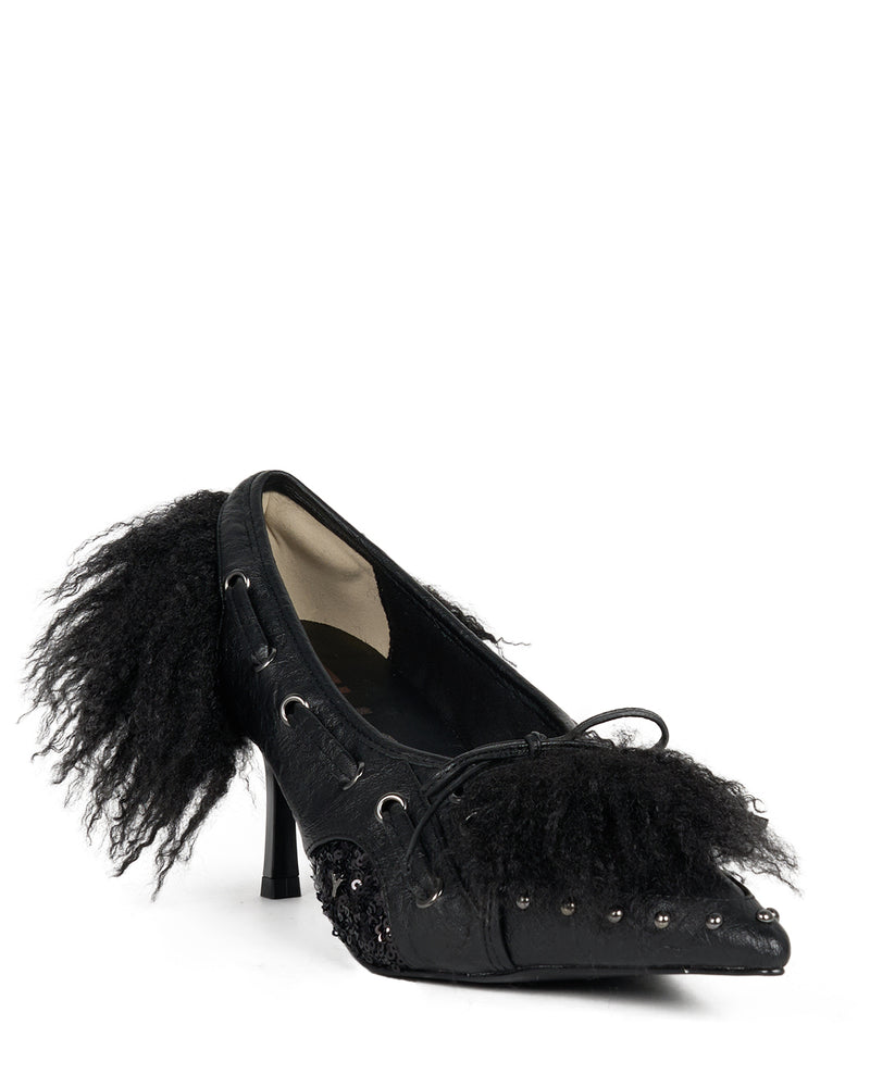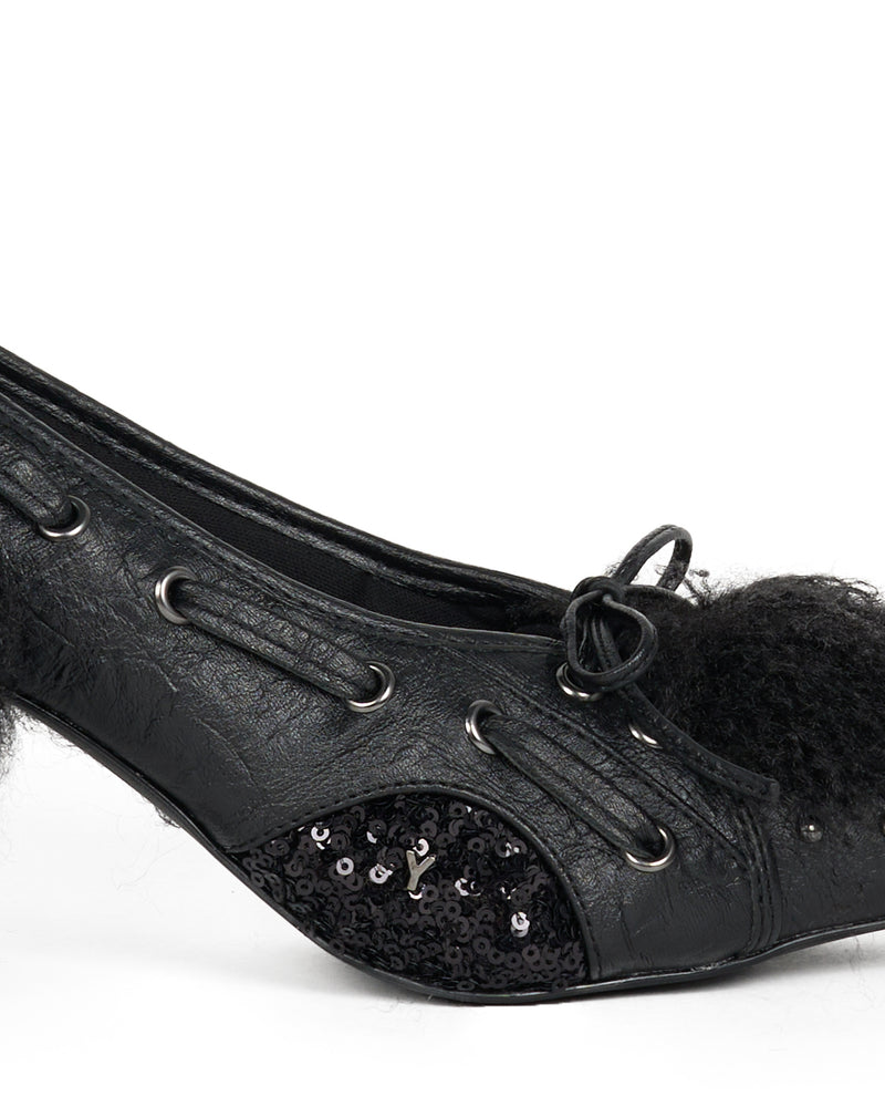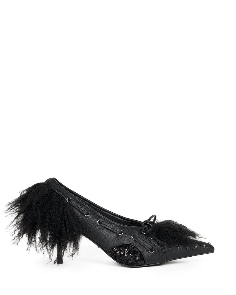 These glamorous pumps combine supple PU leather with dazzling sequins and voluminous faux fur for a statement-making finish. The striking contrast of materials adds depth and dimension, creating a delicate yet dramatic look at your feet. PU laces at the opening and front add a bold accent, while stud detailing at the toe enhances the design’s distinctive character. A sleek pointed toe lends a refined touch, and the 7cm stiletto heel provides subtle lift and stability without compromising on comfort. Perfect with full-length trousers for a modern look, or paired with socks and tights for a polished occasion style, this versatile pair transitions effortlessly across seasons.