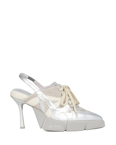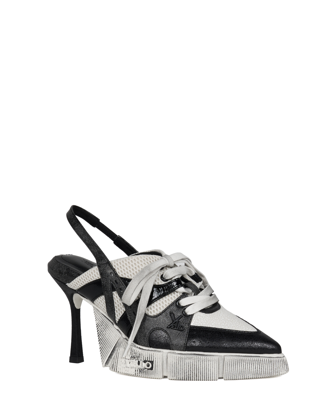 A signature YELLO sneaker mule featuring a bold, three-dimensional silhouette created through a complex fusion of PU, suede, and mesh materials.
