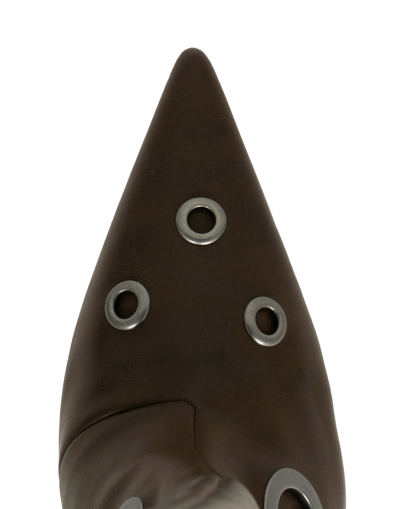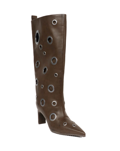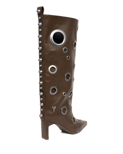 Showcasing this season’s theme, these long boots feature a refined silhouette and a minimalist, zip-free design crafted in luxe PU material. The sharply pointed toe and wide shaft create a sleek, leg-slimming line. A 7cm heel ensures a powerful, leg-lengthening effect. The lineup includes black and white, plus bold shades like red, blue, and green, each accented with all-over eyelets for an edgy, industrial flair. A signature logo charm on the side adds subtle branding. Complete with flexible shark soles and sturdy flat heels for all-day comfort. A bold and versatile pair from early fall to spring.