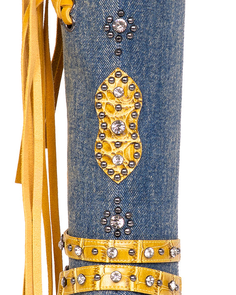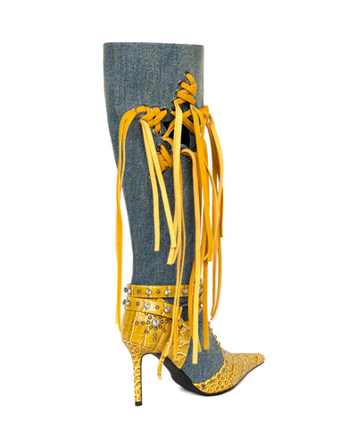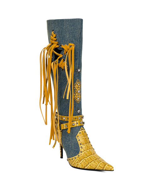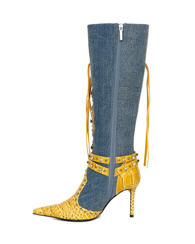 These long boots feature a bold, three-dimensional design and a sleek silhouette. Star-shaped cutouts with eyelets are threaded with cascading fringe, giving the boots a luxurious, vintage-inspired flair. The pointed toe and approximately 9.3cm heel visually elongates the legs, while the ankle belt detail adds a delicate, slimming effect. Crafted from carefully selected materials including faux croc, denim, and PU, and embellished with studs and jeweled accents, the boots offer a layered, high-end look. Available in chic black, rich wine, and edgy purple—these boots bring distinctive character to any fall and winter outfit.