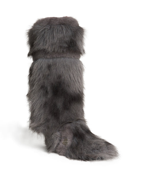 This adorable mule and leg warmer set is all about playful luxury, wrapped in plush faux fur for an irresistibly cute look. The soft, thick fur gently cocoons your feet, while the rounded toe adds a touch of feminine charm. Voluminous leg warmers smooth over the leg line and, combined with the 7.7cm heel, create a beautifully elongated silhouette. Two types of ultra-soft faux fur are used to add depth and dimension through contrasting textures. The removable leg warmers allow you to style the pair in multiple ways, adapting to different looks and occasions. A statement piece that brings a touch of luxury to any outfit, starting from the feet up.