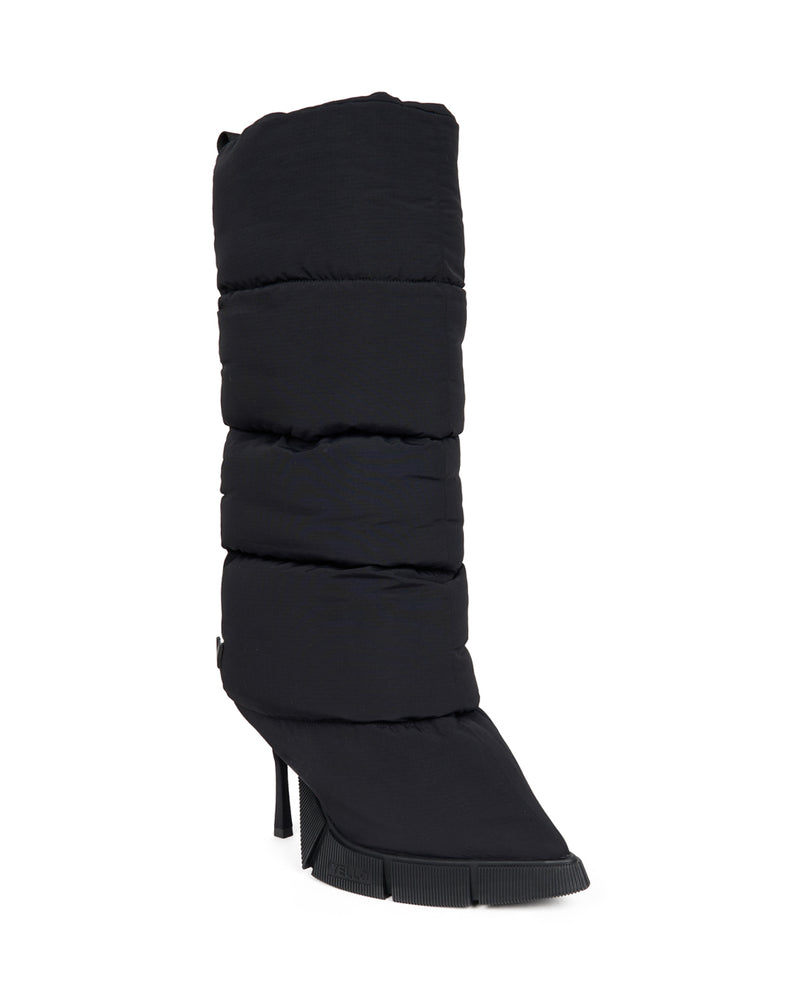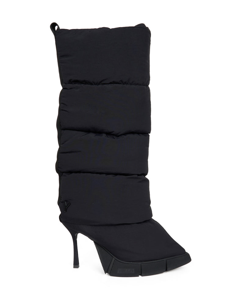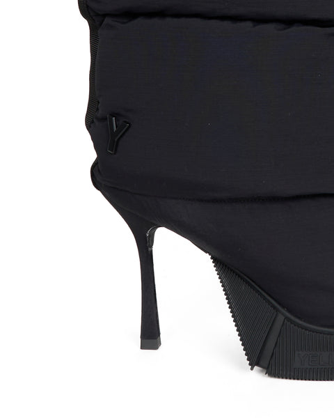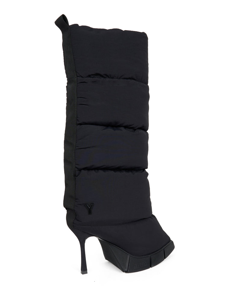These long boots are as unique as they are striking, designed to look as though a puffer jacket has been transformed into footwear. Generously padded throughout, they provide exceptional warmth while gently hugging the entire foot for a secure, comfortable fit. The over-the-knee length and voluminous silhouette conceal the leg line for a dramatic, fashion-forward look, while a sharp 9.6cm heel paired with YELLO’s original pointed sporty sole creates a sleek, elongated silhouette. An iconic logo charm at the side adds a refined accent. Available in two colorways — a sophisticated urban black and a camouflage pattern that pairs effortlessly with street and vintage-inspired styles — this pair showcases YELLO’s signature creativity in every detail.