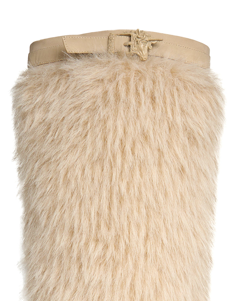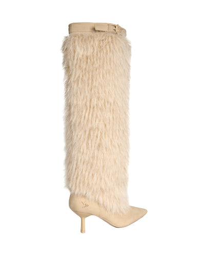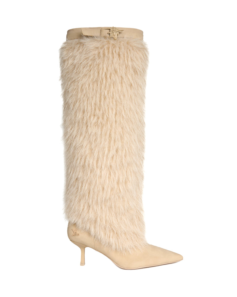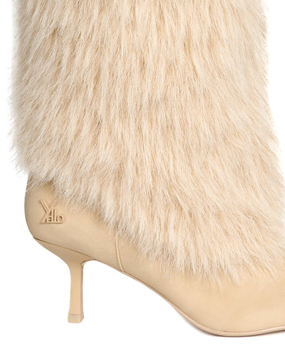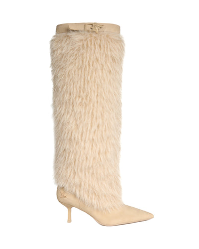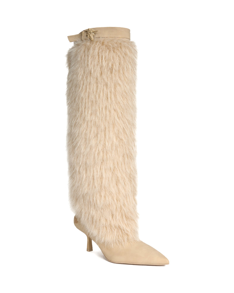 Crafted with luxuriously soft faux fur, these long boots bring a rich, elevated presence to any winter look. The textured fur creates depth and dimension through its natural shading, while the vertical pattern visually elongates the legs for a beautifully straight silhouette. A unicorn-inspired buckle at the opening adds a refined yet imaginative accent, balancing elegance with a hint of playful character. The sharply pointed toe and slender 6.6cm heel offer a perfect balance — high enough to flatter, yet comfortable enough for everyday wear — resulting in a silhouette that feels both polished and effortless. Finished in a range of feminine tones, this pair adds a touch of radiance to cold-weather styling. A truly unique design that blends sophistication with creativity in YELLO’s signature style.