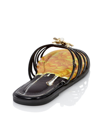 Cute flat sandals with a glittering and unique charm.