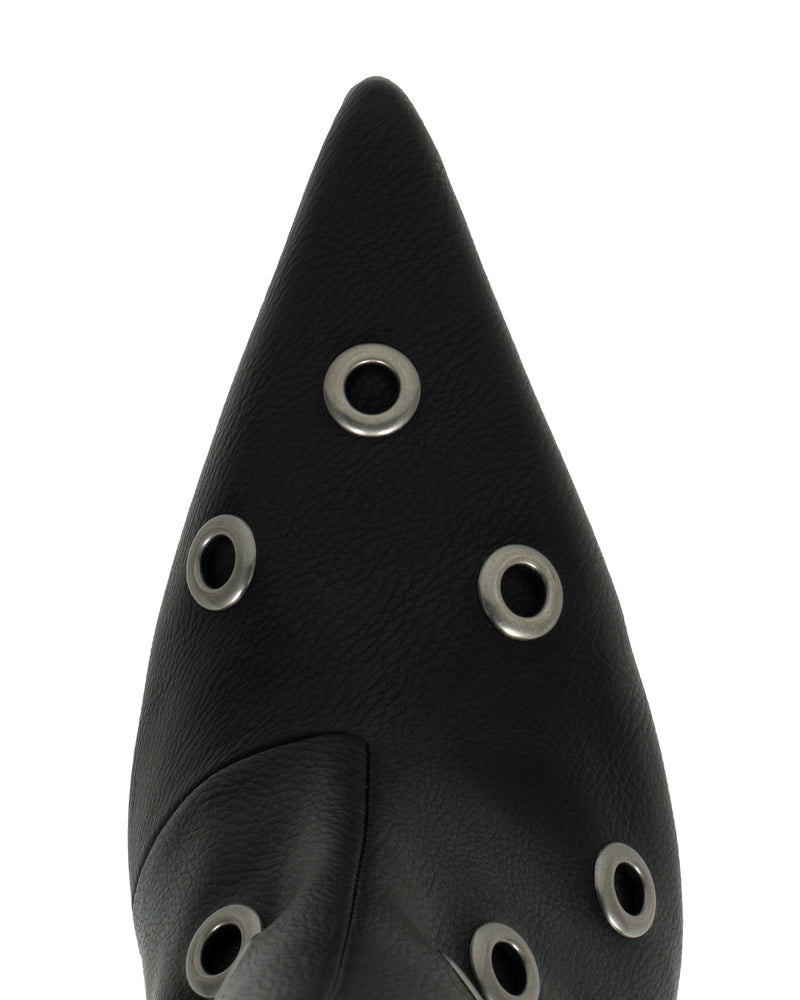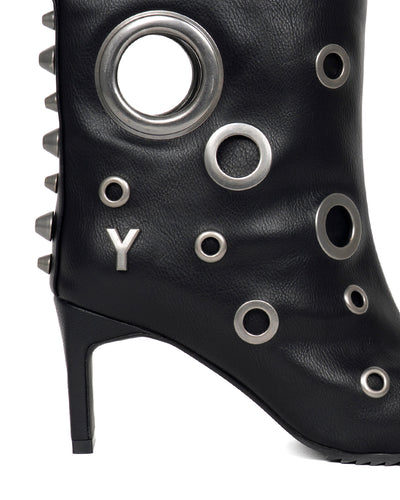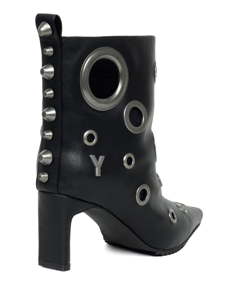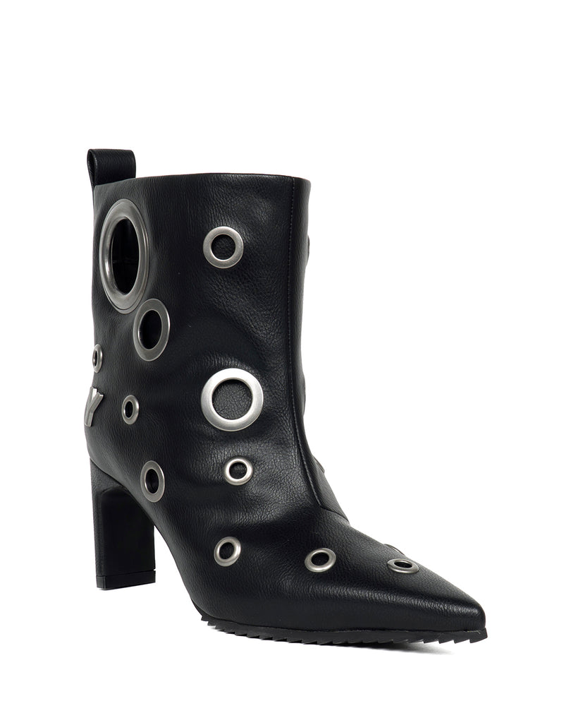 This season’s signature short boots feature a sleek, modern silhouette with a smart zip-free design. Made from high-quality PU material with a smooth finish, the sharp pointed toe adds elegance to every step. The wide shaft allows for pants-in styling while visually slimming the legs. Elevated by a 7cm heel, these boots provide a striking leg-lengthening effect. Available in four color options: classic black and white, plus black and brown with industrial-style eyelets for a bold twist. Shark soles flex with your stride, and flat heels offer stable support. From fall to spring, this pair adds refined drama to any outfit.