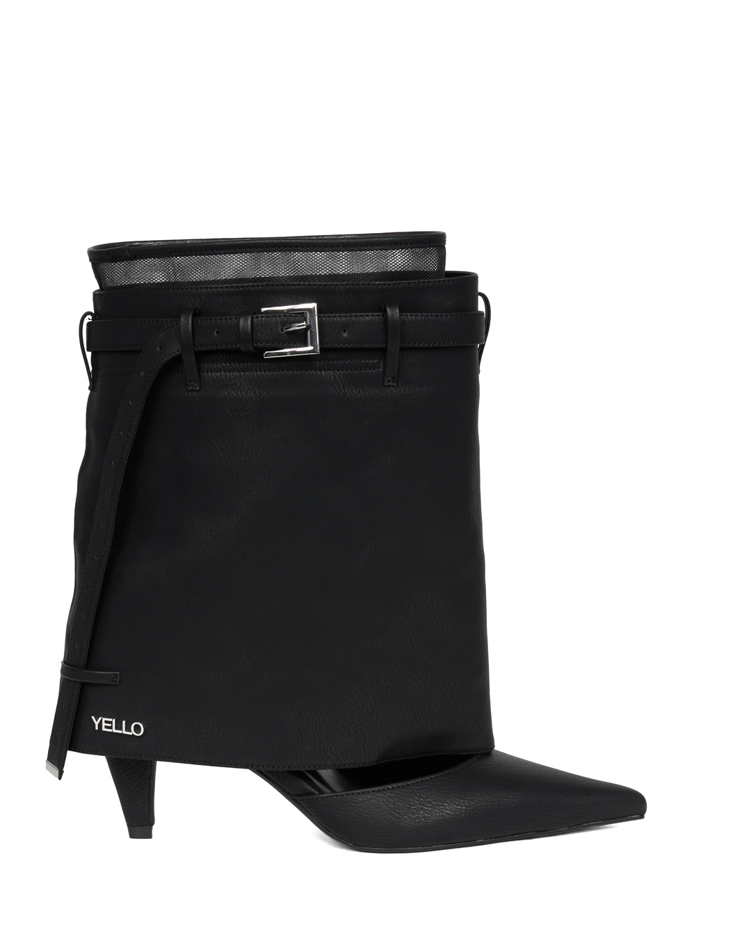 A refined, architectural silhouette that fuses the essence of a mule and a boot into one striking design.