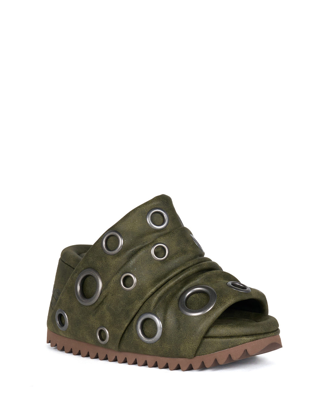 The three-dimensional, gathered upper is randomly adorned with eyelets in varying sizes, creating an industrial yet subtly organic mood.