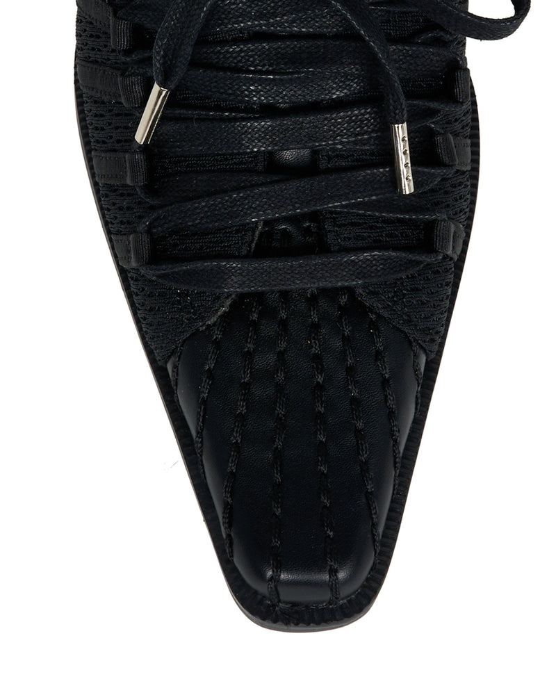 Point stitching at the toe, an elongated pointed toe shape, and delicate lace-up detailing work together to visually elongate the legs.