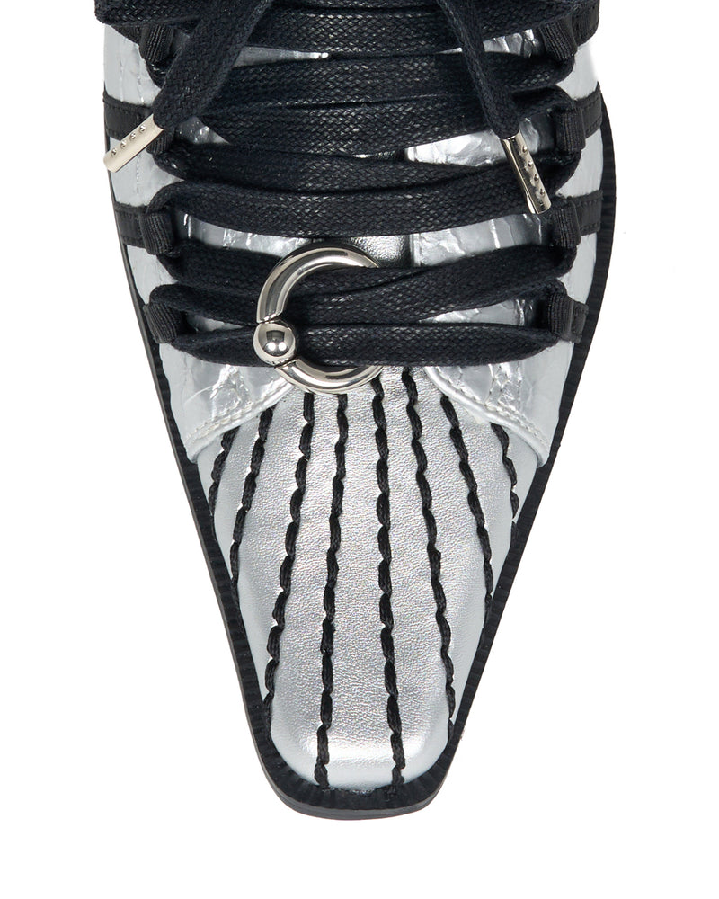 Point stitching at the toe, an elongated pointed toe shape, and delicate lace-up detailing work together to visually elongate the legs.