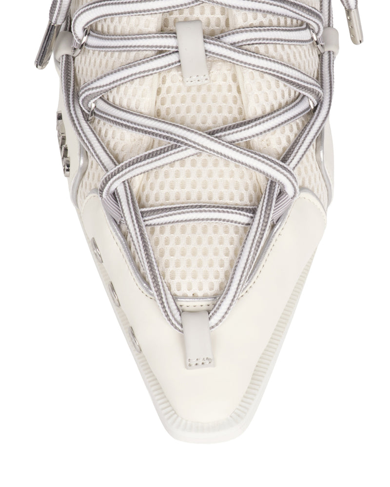 Precisely engineered lines, trims, and lace detailing are paired with metal eyelets at the toe, introducing an industrial, engineered aesthetic.