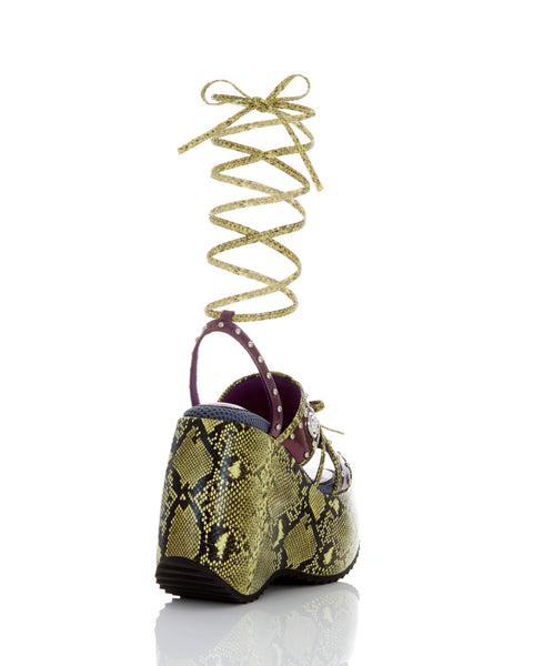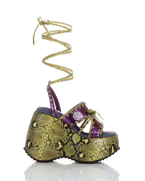 Featuring a dramatic 14.5cm sculpted wave sole and removable lace-up straps, this design creates a sleek, elongated leg line with an edgy touch.