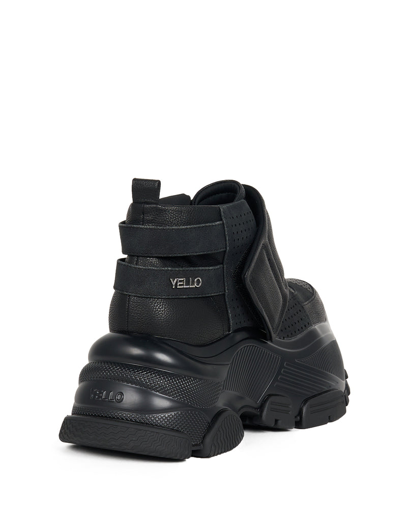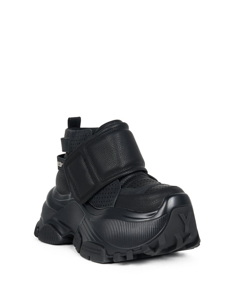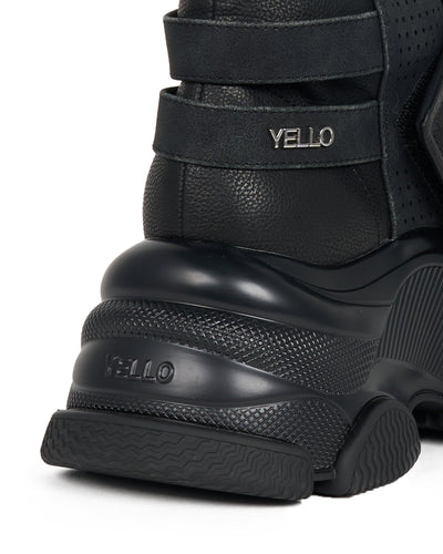 These platform short boots make a bold impression with their chunky sole and rugged, industrial-inspired silhouette. The signature platform — measuring approximately 7.6cm — delivers a powerful leg-lengthening effect, while a wide Velcro strap makes them easy to slip on and off. Perforated and stitched detailing across the upper adds depth and structure, balancing the bold shape with a refined finish. Choose from three colors: black, white, or statement brown, finished with dramatic studs and piercings. The brown pair is crafted with a hand-aged sole, giving it a distinctive, vintage-inspired character. Edgy yet versatile, this standout style adds instant attitude to any look.
